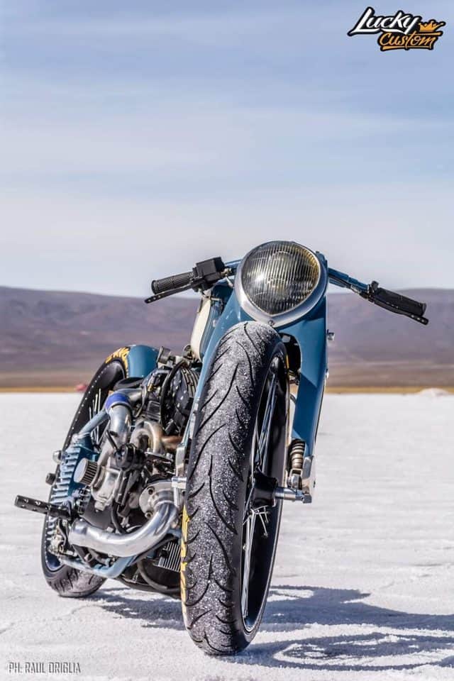 The project started with a mission: to celebrate the shop’s 10th anniversary. Even before the first sketch was drawn, Lucas Layum, the owner of the Lucky Custom, already knew this machine would be inspired by the “dry lake racers”, the kind of bikes you see breaking speed records at Bonneville or El Mirage.