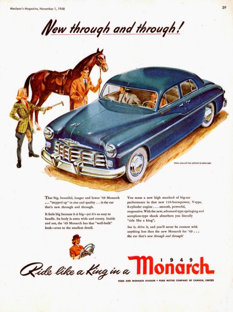 In 1946 Ford introduced Monarch, a distinctive brand for the Canadian market. The vehicles were built by Ford Canada as badge-engineered Mercurys, with some exclusive styling features to set them apart from other cars from the company.