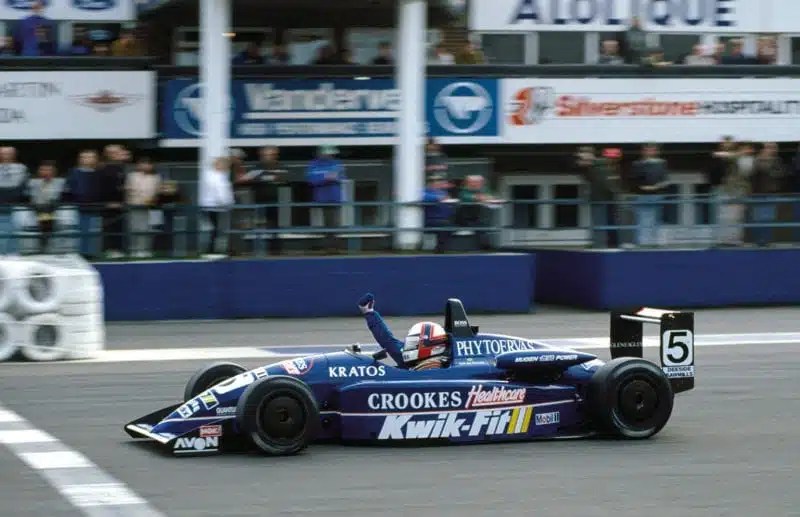 de Ferran celebrates another win, during the 1992 British F-3 season.