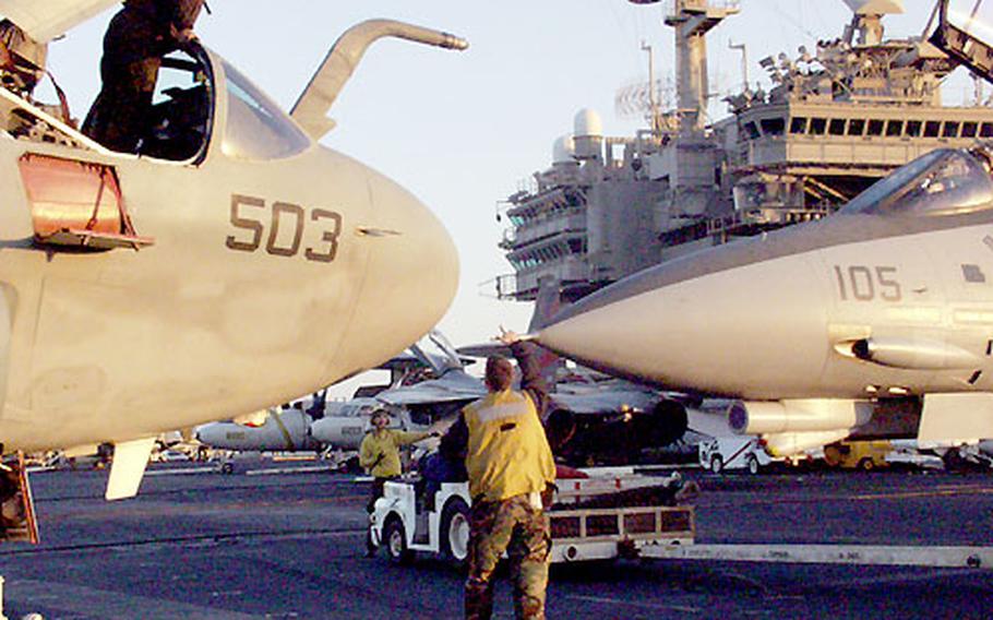 The Kitty Hawk’s bustling deck, during the second invasion of Iraq.