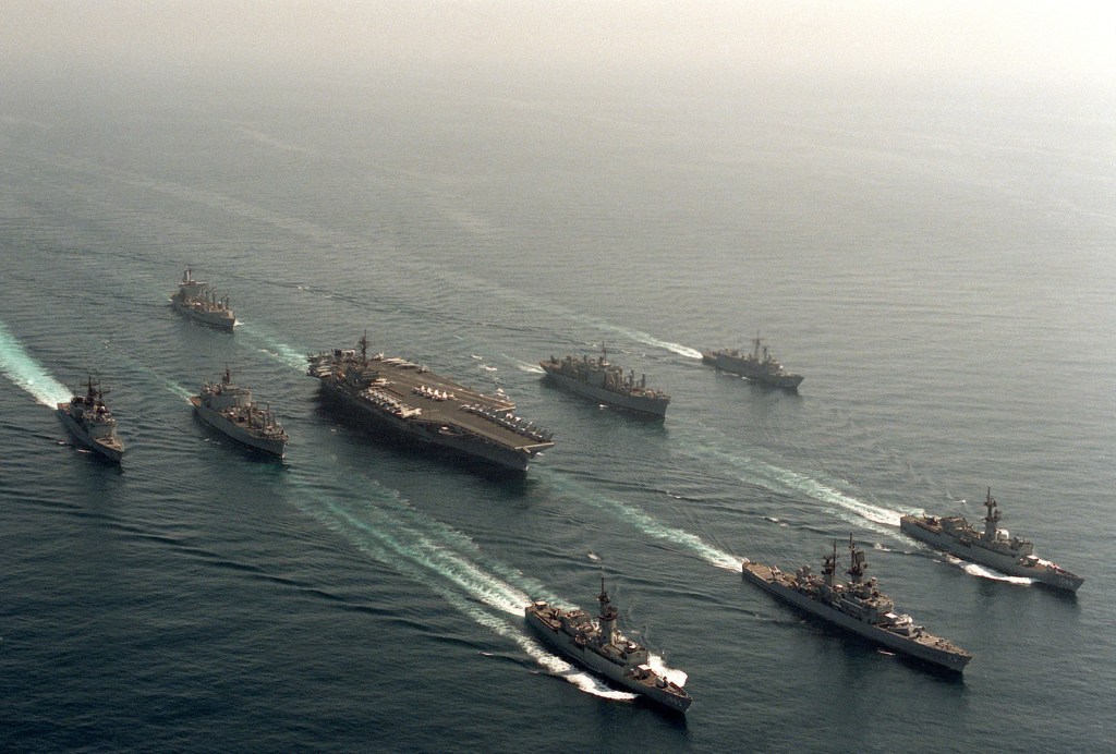 An aerial view of the aircraft carrier USS KITTY HAWK (CV-63) and its battle group.