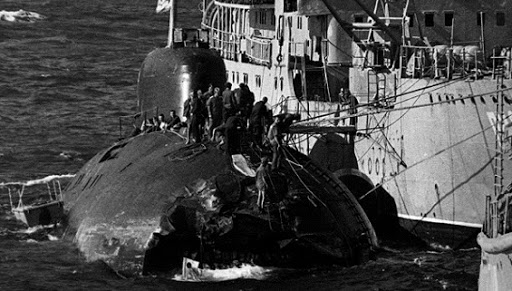 “I was on the bridge at the time of the incident, monitoring one of the two radars. “We felt a sudden shudder, a fairly violent shudder. We immediately launched two helicopters to see if we could render any assistance to them but the Soviet sub appeared to have suffered no extensive damage“.