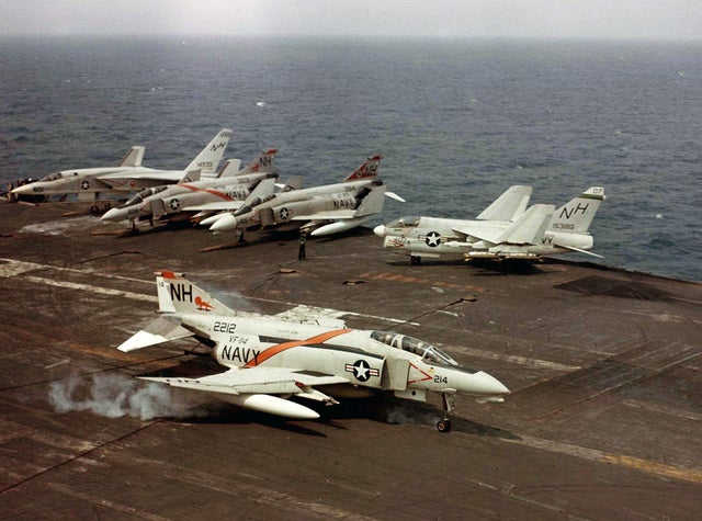 A F4 Phantom lands on USS Kitty Hawk after a mission over Vietnam, in 1966