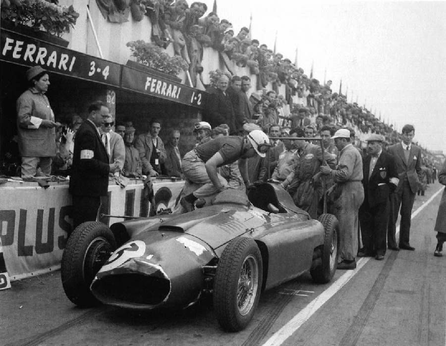 Fon drove for Ferrari in six races and his best performance was Silverstone. He was in third, behind Fangio and Moss, when he was called back to the pits, and the team manager asked the Marquis to give his car to his teammate Peter Collins. In a situation like that, the two drivers would share the points at the end of the race. Portago complied with the orders, visibly not happy. At lap 80, another Ferrari driver, Eugenio Castelotti, came to the pits and retired from the race after being involved in a minor collision. Fon asked if the car was still drivable and the mechanics answered “barely”. To Portago, that was good enough, he jumped into the battered Ferrari and left the pits like a maniac. (picture above)