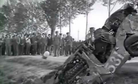 With only 30 km to the finish line, Fon was approaching the small town of Guidizzolo. He was going flat out on a straight, at 220km/h, when one of the front tires exploded. The Spaniard lost control of the car and hit a telephone pole, then it flew over a brook, plowing a few spectators in its way. The destroyed Ferrari bounced back, running over more spectators, and finally stopped upside down, in a ditch on the other side of the road.