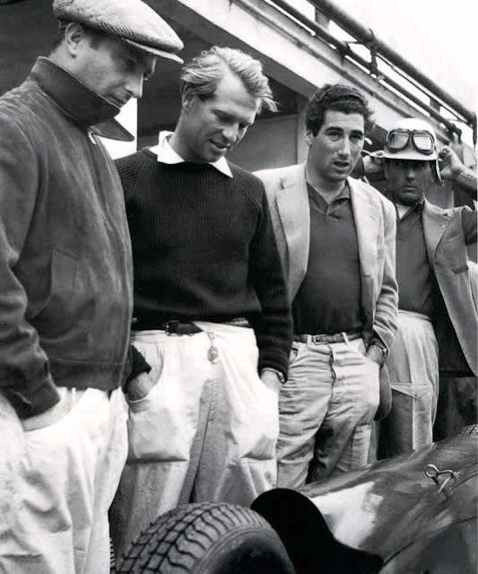 From left to right, Manuel Fangio, Peter Collins, Alfonso de Portago, and Luigi Musso. German GP, 1956